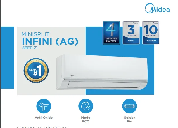 Ahorra energía con el aire acondicionado Midea. Su compresor Inverter Quattro ajusta de manera precisa para un ahorro del 70%. El chip Smart Energi garantiza un uso eficiente del compresor. Además, cuenta con modo ECO para reducir el consumo hasta un 60% por 8 horas continuas. Protegido contra varia...
